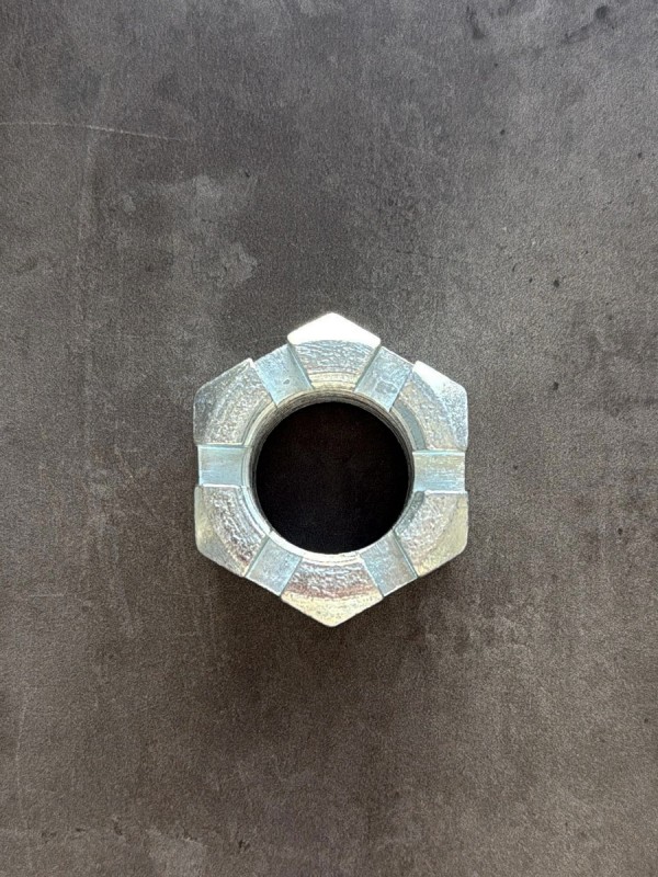 Гайка М24х1,5 корончатая, мелкий шаг резьбы. Гайка российского производства. Артикул: 853514. Применяемость: гайка рулевого пальца КАМАЗ. Диаметр резьбы: 24 мм. Шаг резьбы: 1,5. Высота: 20 мм. Размер "под ключ": 36 мм. Высота от опорной поверхности до основания прорези: 14 мм. Покрытие: цинк.