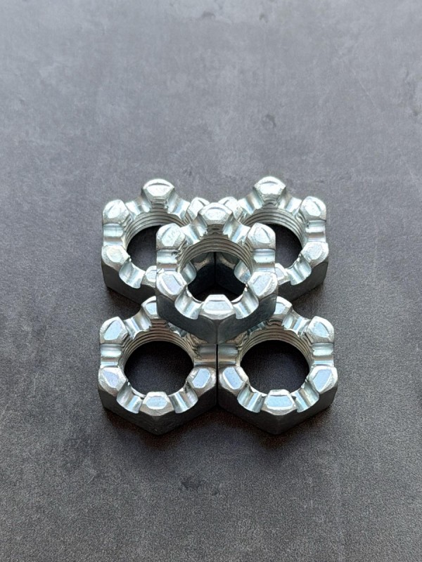 Гайка М24х1,5 корончатая, мелкий шаг резьбы. Гайка российского производства. Артикул: 853514. Применяемость: гайка рулевого пальца КАМАЗ. Диаметр резьбы: 24 мм. Шаг резьбы: 1,5. Высота: 20 мм. Размер "под ключ": 36 мм. Высота от опорной поверхности до основания прорези: 14 мм. Покрытие: цинк.